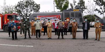 Usai apel, Bupati Kuansing Mursini bersama tim gugus Tugas Percepatan Penanganan Covid-19 langsung melakukan penyemprotan disinfektan di wilayah kota Teluk Kuantan. Bupati Mursini sendiri melakukan penyemprotan di Masjid Al-Furqon Teluk Kuantan (Rls)