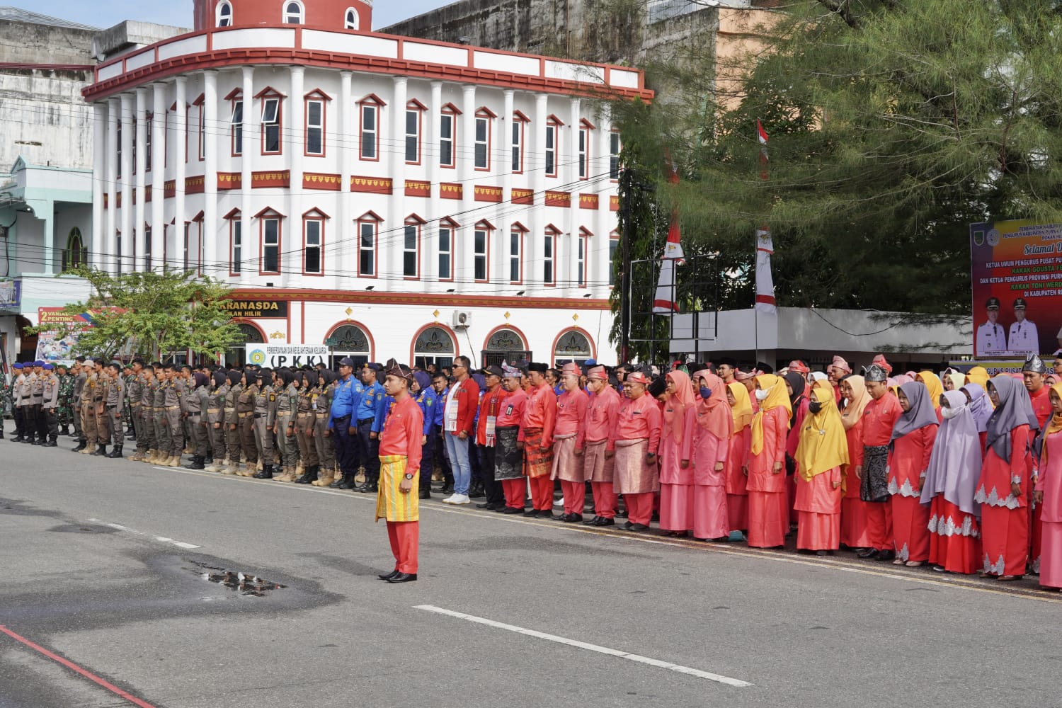 Bupati Rohil Afrizal Sintong secara langsung memimpin upacara peringatan HUT Rohil ke 23 yang di pusatkan di depan kantor BPKAD, Jalan Merdeka, Bagansiapiapi, Selasa (4/10/2021).