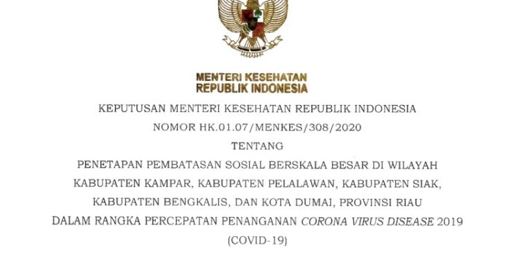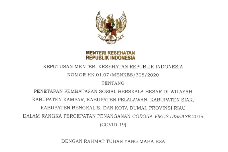 Persetujuan itu tertuang dalam Keputusan Nomor HK.01.07/MENKES/308/2020 Tentang Penetapan PSBB Di Wilayah Kabupaten Kampar, Kabupaten Pelalawan, Kabupatek Siak, Kabupaten Bengkalts, Dan Kota Dumai, Provinsi Riau, Dalam Rangka Percepatan Penanganan Covid-19.