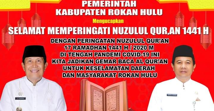 Lanjut pak H.Sukiman (Bupati) dengan Peringatan Nuzulul Qur’an 17 Ramadhan 1441 H / 2020 M. Ditengah Pandemi Covid-19 ini, Kita Jadikan Gemar Baca Al-Qur’an untuk Keselamatan Daerah dan Masyarakat Rokan Himbaunya,