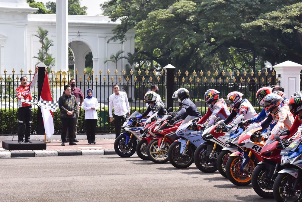 Menutup rangkaian kegiatan di Istana Merdeka, Presiden Jokowi bersama para pembalap menuju Jalan Medan Merdeka Utara.