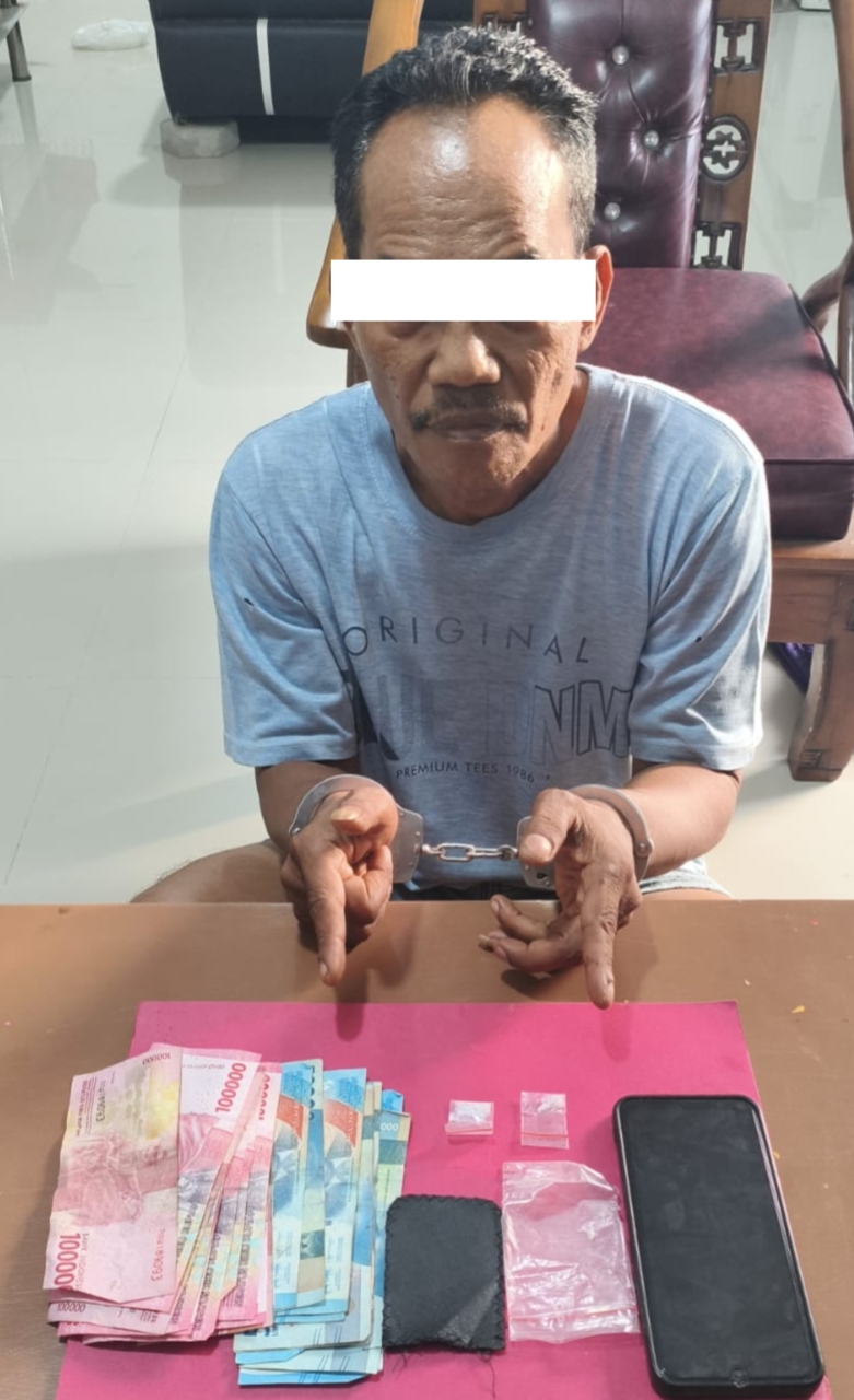 Dari hasil penggeledahan terhadap tersangka, petugas menemukan sejumlah barang bukti yang berkaitan dengan tindak pidana narkotika. Barang bukti tersebut berupa 2 paket kecil diduga sabu yang disimpan di kantong pakaian tersangka, 1 unit handphone merek Vivo warna biru yang diduga digunakan untuk komunikasi transaksi, serta uang tunai sebesar Rp1.700.000 yang diduga hasil dari peredaran narkotika. Selain itu, turut diamankan perlengkapan pendukung seperti sarung timbangan dan plastik pembungkus yang biasa digunakan untuk mengemas sabu.