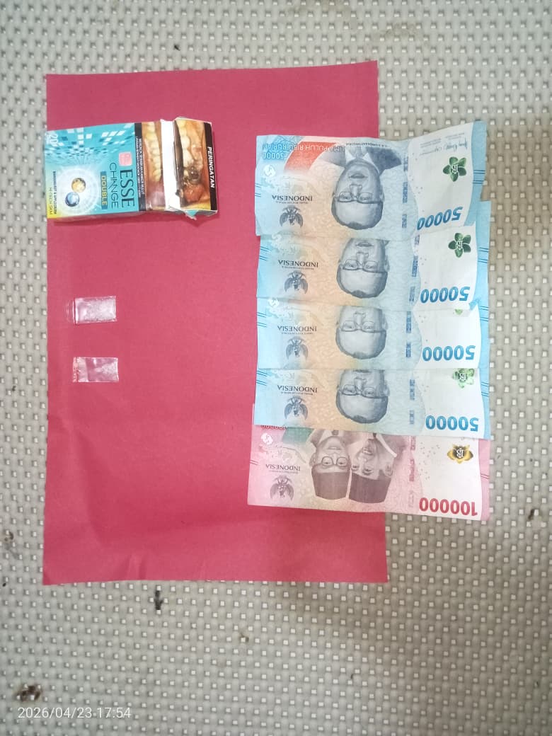 Dari tangan tersangka, petugas menemukan sejumlah barang bukti yang menguatkan dugaan keterlibatannya dalam peredaran narkotika. Barang bukti tersebut berupa dua paket kecil diduga narkotika jenis sabu dengan berat kotor total sekitar 0,45 gram, yang diduga siap edar. Selain itu, turut diamankan uang tunai sebesar Rp300.000 yang diduga hasil transaksi narkotika, serta satu unit handphone android merk Vivo warna hitam yang digunakan sebagai sarana komunikasi dalam aktivitas ilegal tersebut.