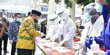 DURI (Riaulantang) – Usai melaksanakan Apel penerapan new Normal di halaman Kantor Camat Mandau, Kamis pagi (11/06/2020), Plh. Bupati Bengkalis meninjau pelaksanaan rapid test dan swab Test di Pasar Mandau dan Mall Mandau City.