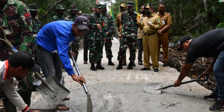 BANDARLAKSAMANA (Riaulantang) – Usai menggelar silaturahmi dengan masyarakat dan jajaran pemerintah di Kantor Camat Bukit Batu, Mayjen TNI R Tjahja Komara, Kamis 23 Juli 2020 langsung meninjau hasil kegiatan Tentara Manunggal Membangun Desa (TMMD) ke-108, di Jalan Parit Medan Desa Api-Api, Kecamatan Bandar Laksamana.